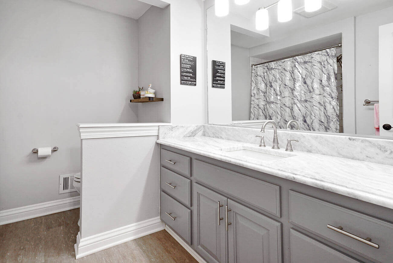 Kid bathProject DetailsA pretty simple upgrade to a kids bathroom that included new flooring, a refinished cabinet, new plumbing and shower fixtures, and new marble countertops. Back to Projects