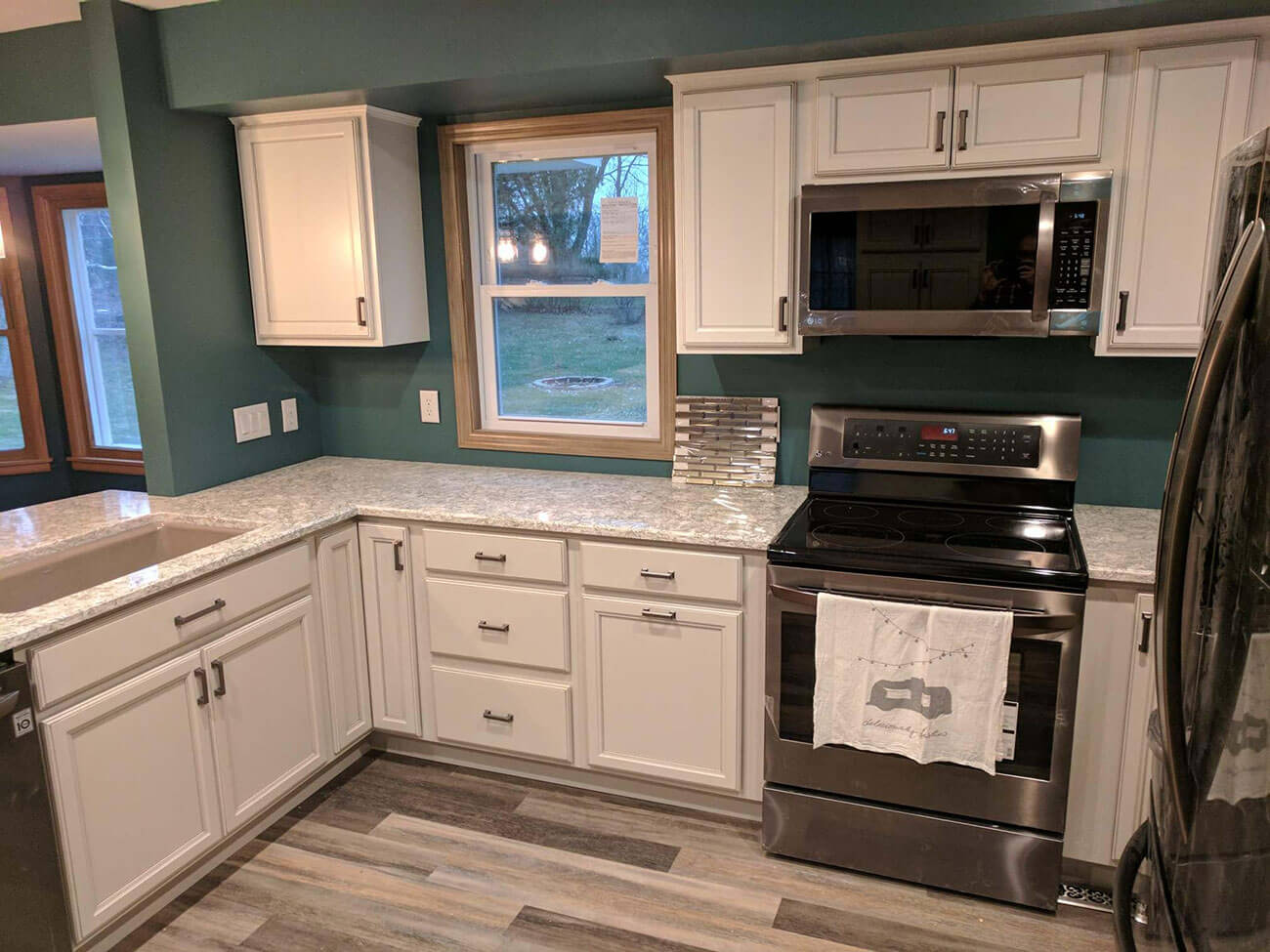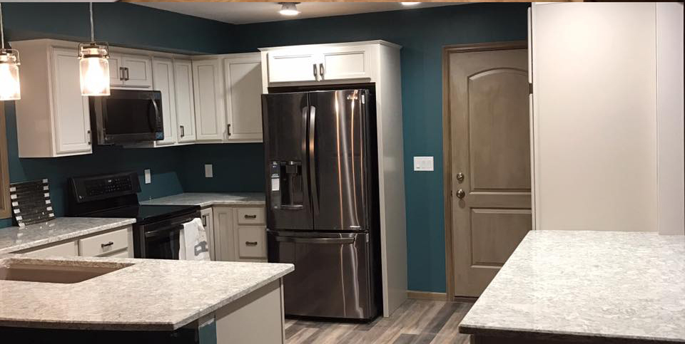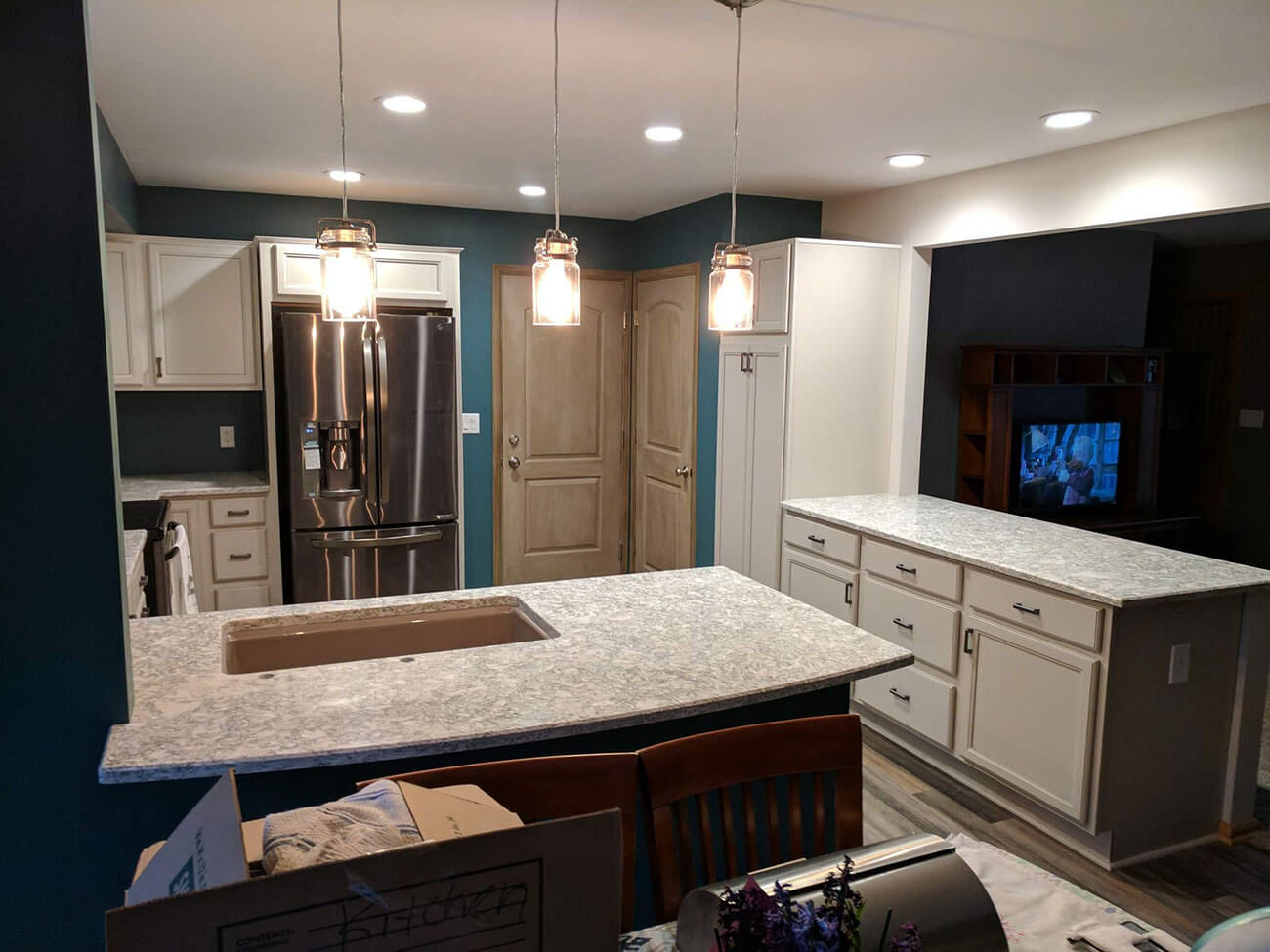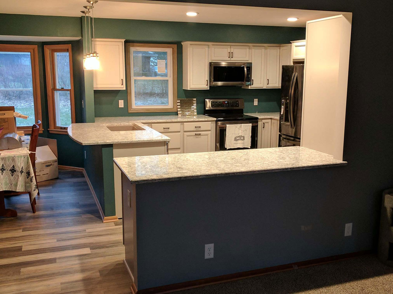 This was a total kitchen makeover that required being gutted down to the studs. We removed two load bearing walls to open up the living room and dining area to the kitchen. All appliances and mechanicals were re-routed to better suit a more entertainment style layout and help the kitchen flow.