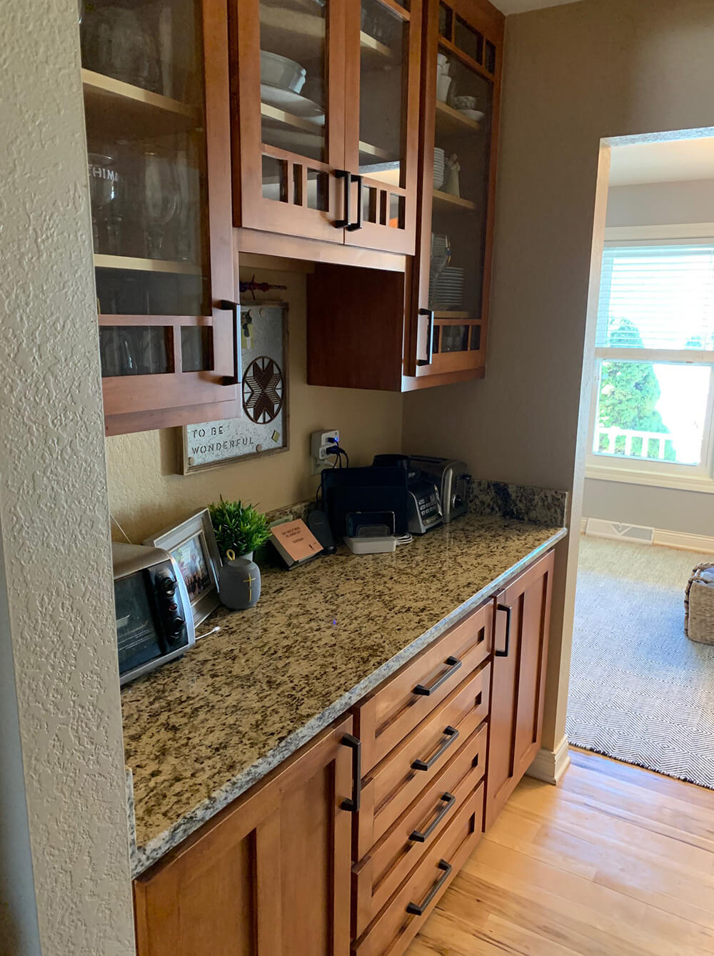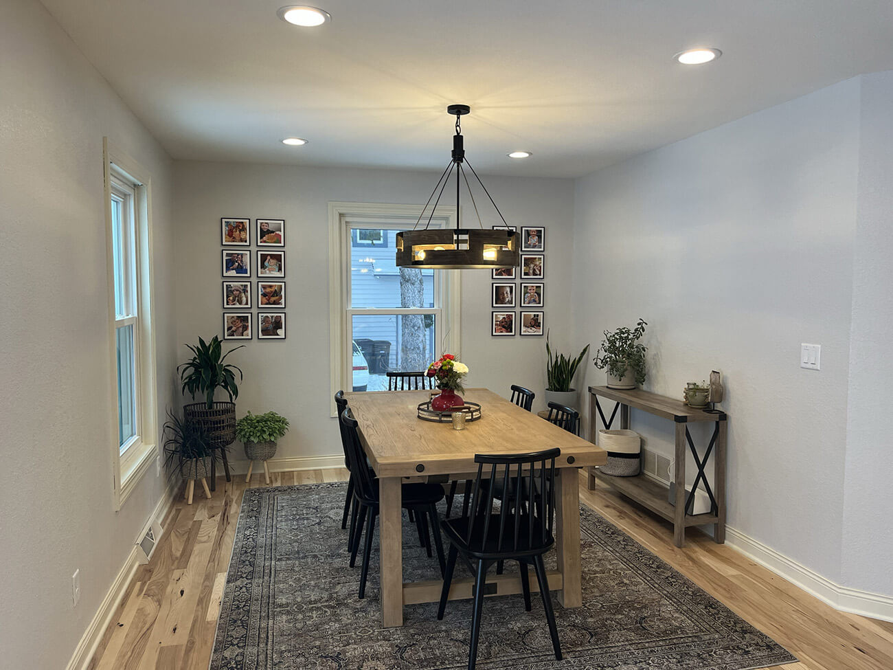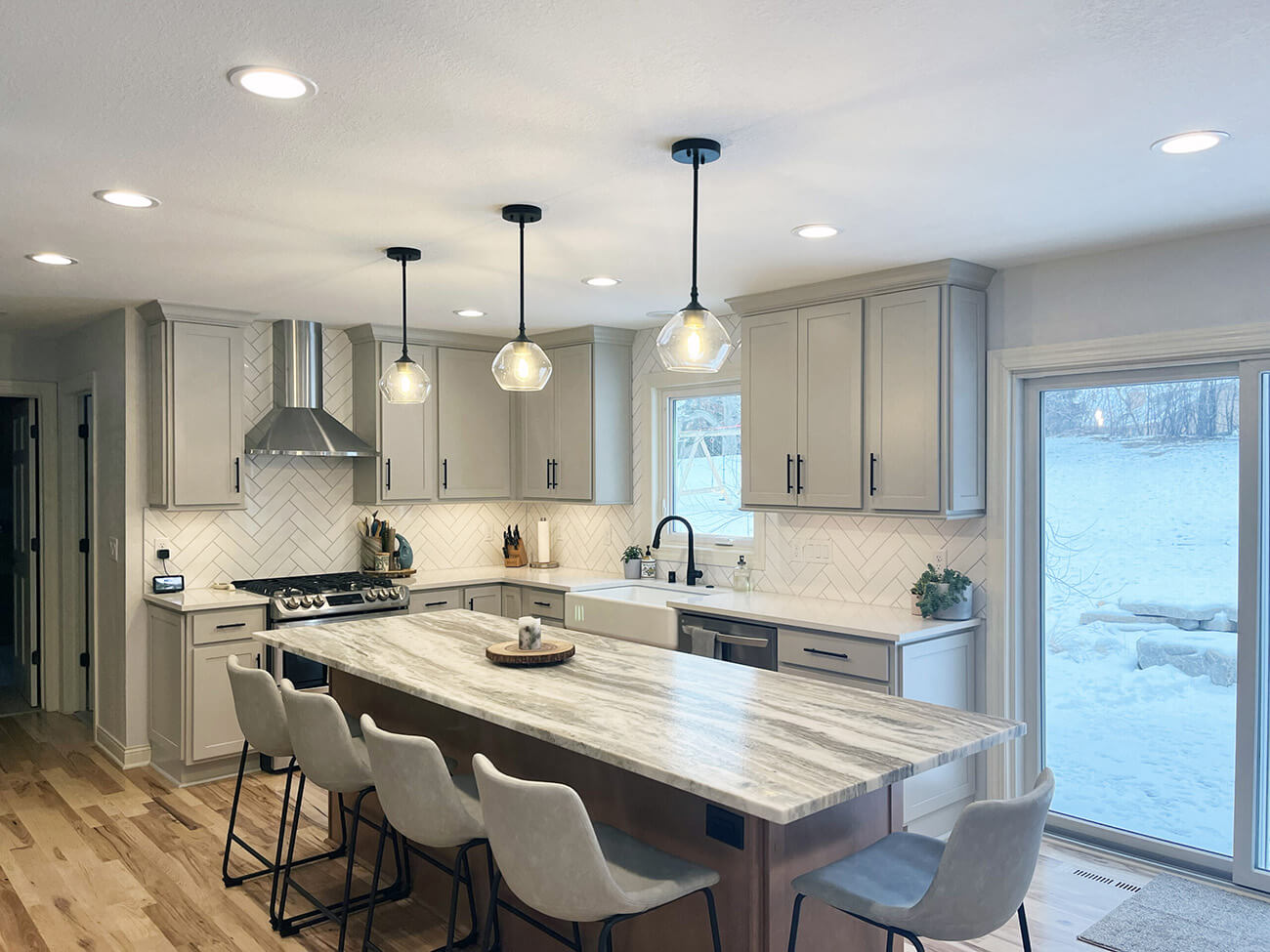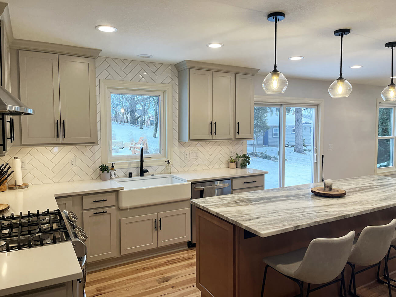 Our client was looking to freshen up and expand their kitchen, dining, and pantry space. We took down a wall between the old dining area and office to expand the overall eating area and lengthen their island for more ample seating. We replaced all of the cabinets, counters, and refinished all of the hardwoods throughout the main level. We chose a very Scandinavian look and feel with light gray and natural wood color tones in addition to oil rubbed bronze fixtures.