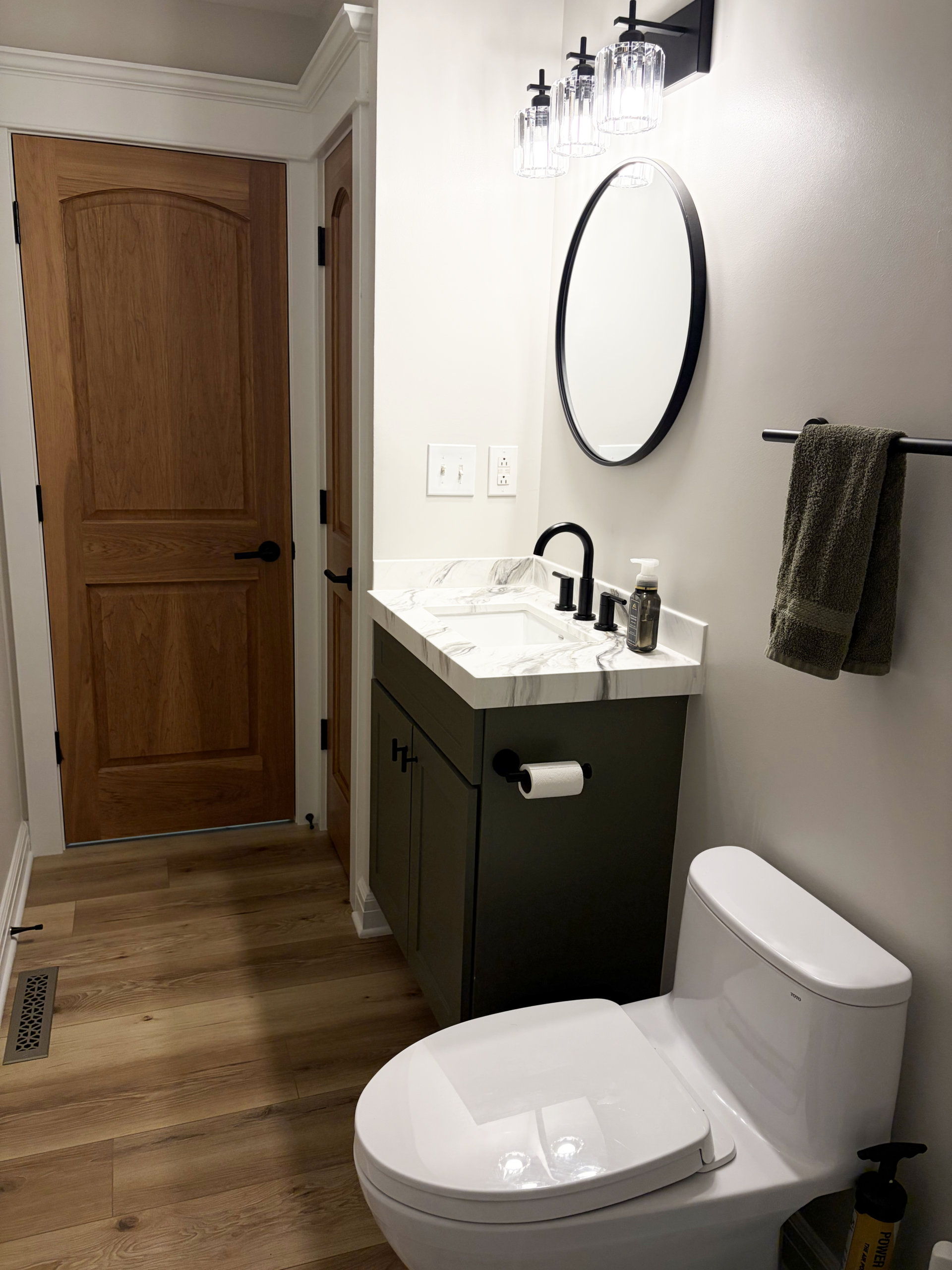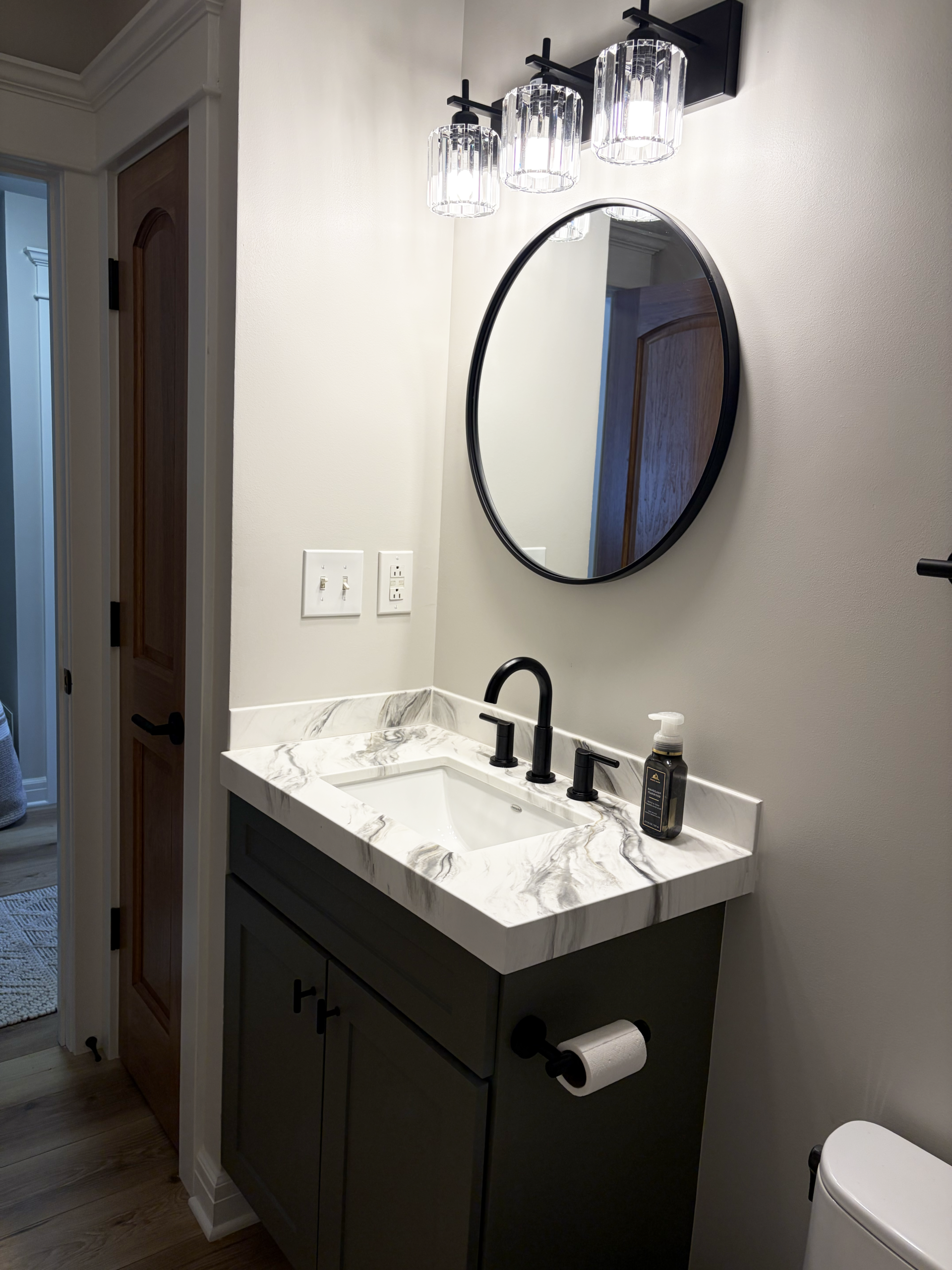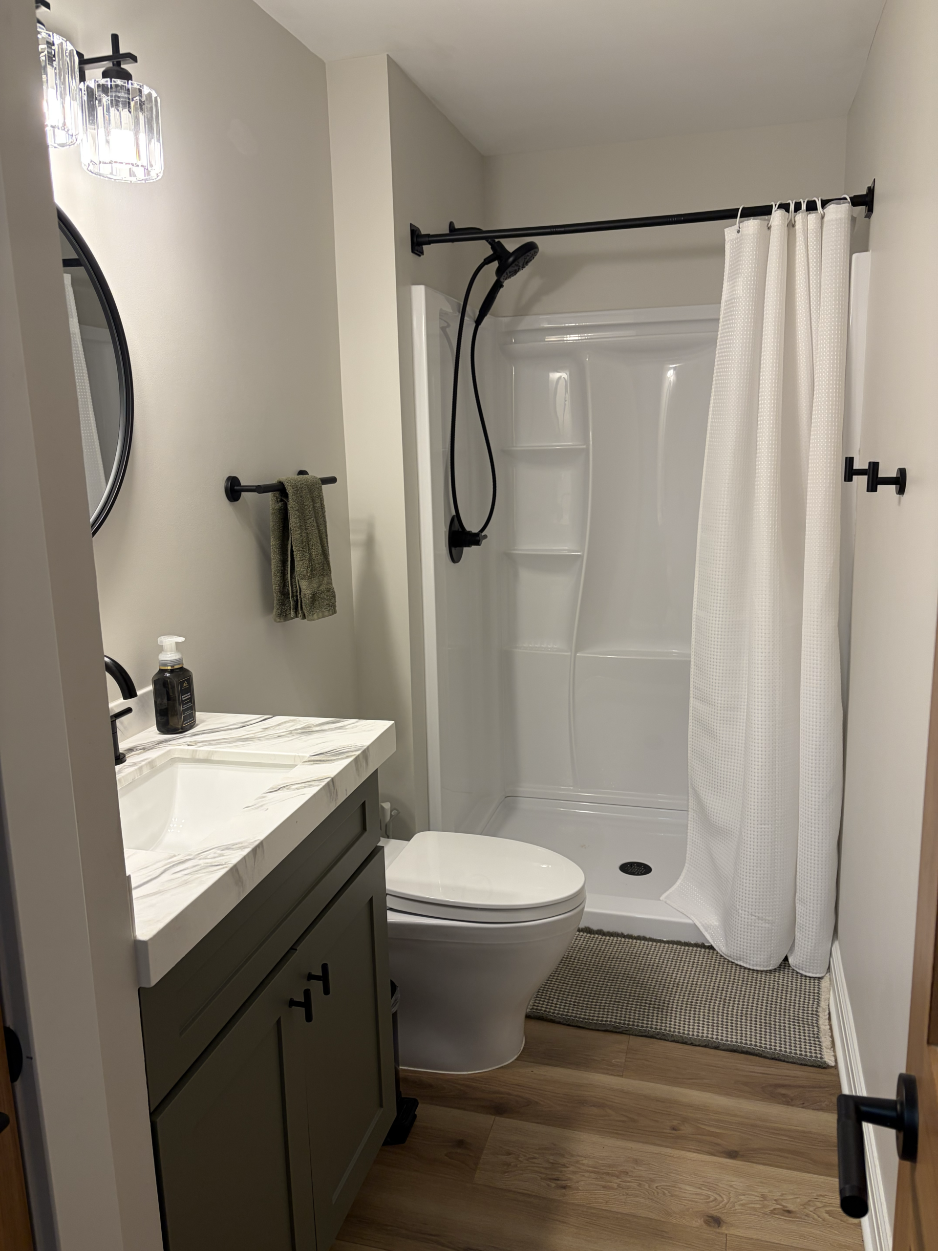 Our client had an outdated and very cramped bathroom right off the mudroom that was specificially for the husband’s use due to the nature of his job in the trades. We came in and made the 30″x30″ shower into a 36″x48″ for more ample space and replaced the plumbing fixtures, lighting fixutres, and flooring, and then refaced the cabinet with new doors and counters.