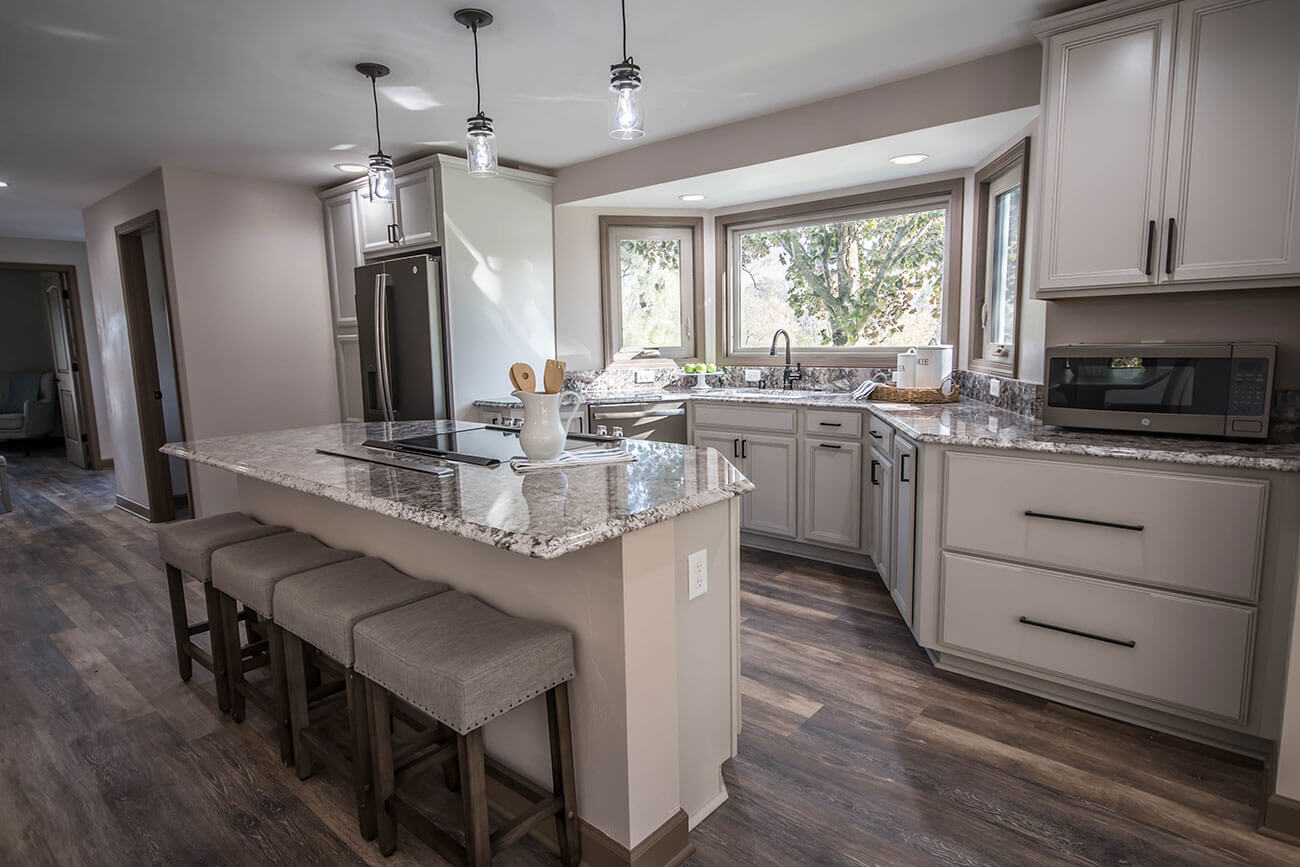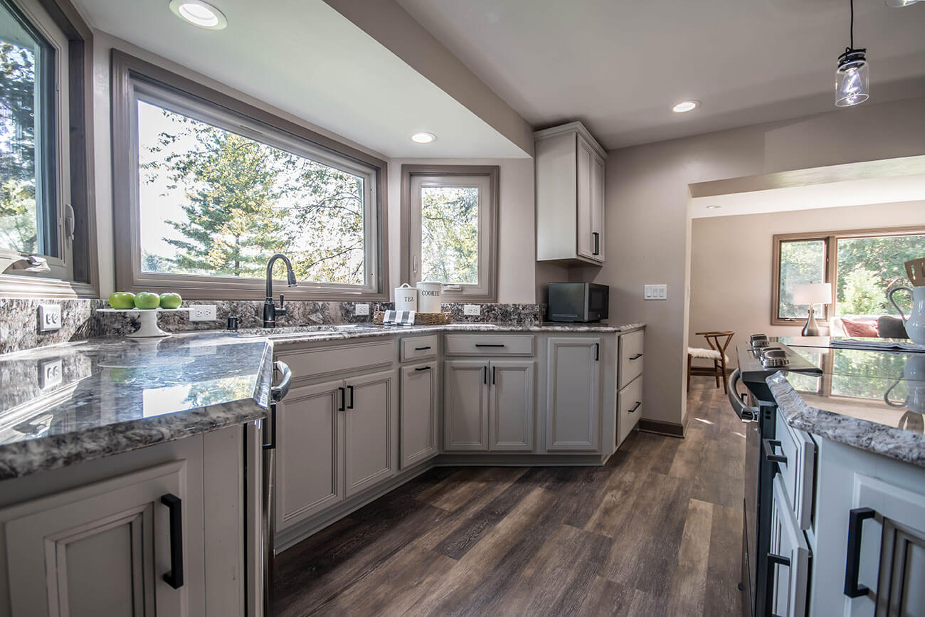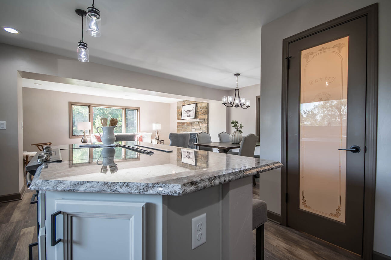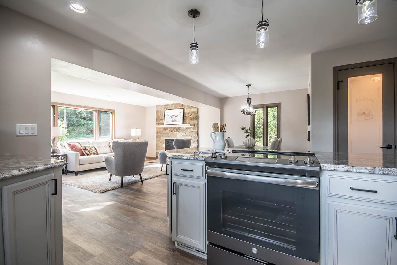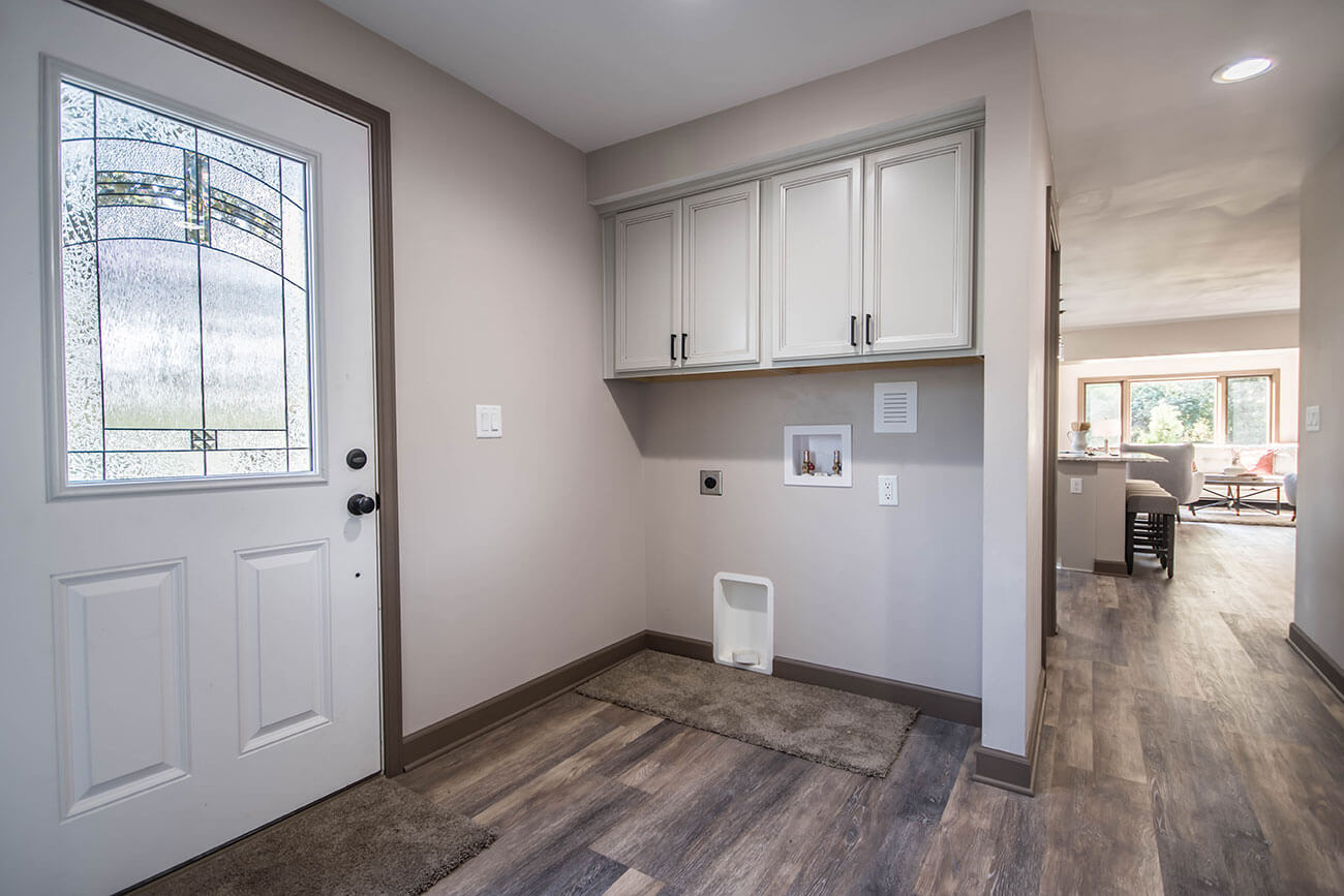 This farm house had been comprised of a series of add-ons upon add-ons, leaving it like a very narrow hallway in every room. We came in and gutted everything down to the studs, removed every interior wall and reinforced with 6 load bearing beams to create a much more open and usuable space. We replaced many windows, all the trim and doors, and added a little walk-in pantry.