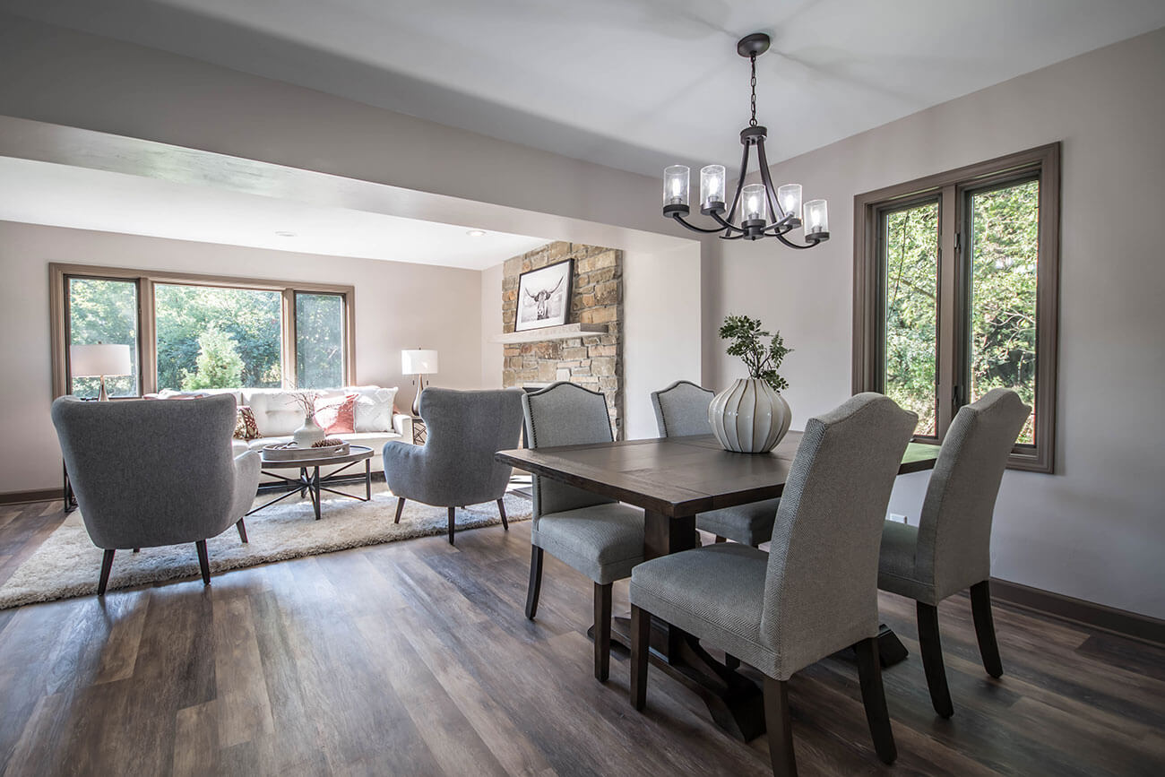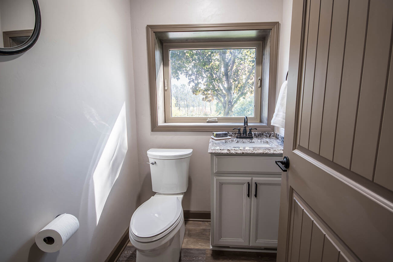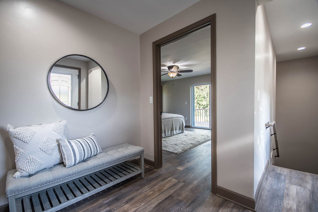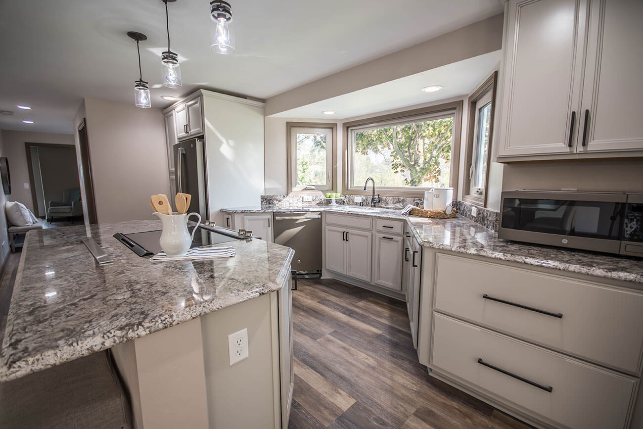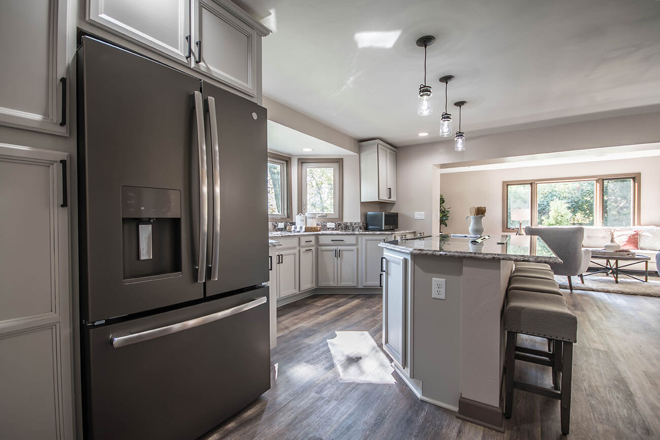 This farm house had been comprised of a series of add-ons upon add-ons, leaving it like a very narrow hallway in every room. We came in and gutted everything down to the studs, removed every interior wall and reinforced with 6 load bearing beams to create a much more open and usuable space. We replaced many windows, all the trim and doors, and added a little walk-in pantry.