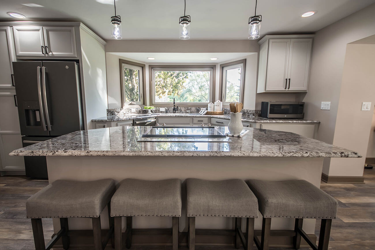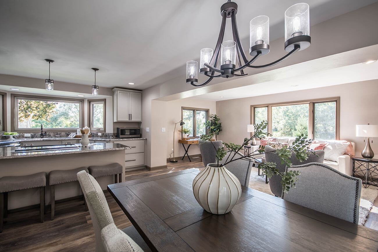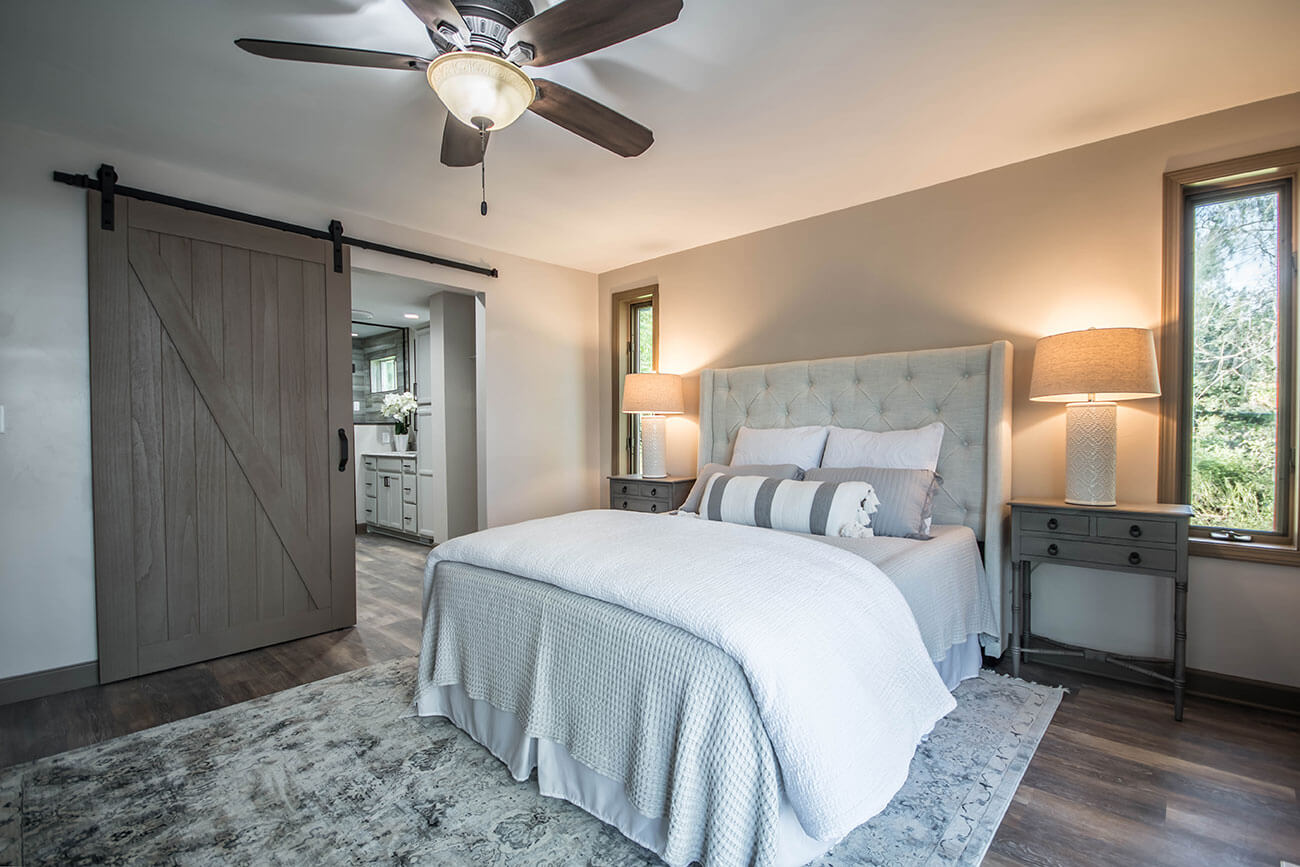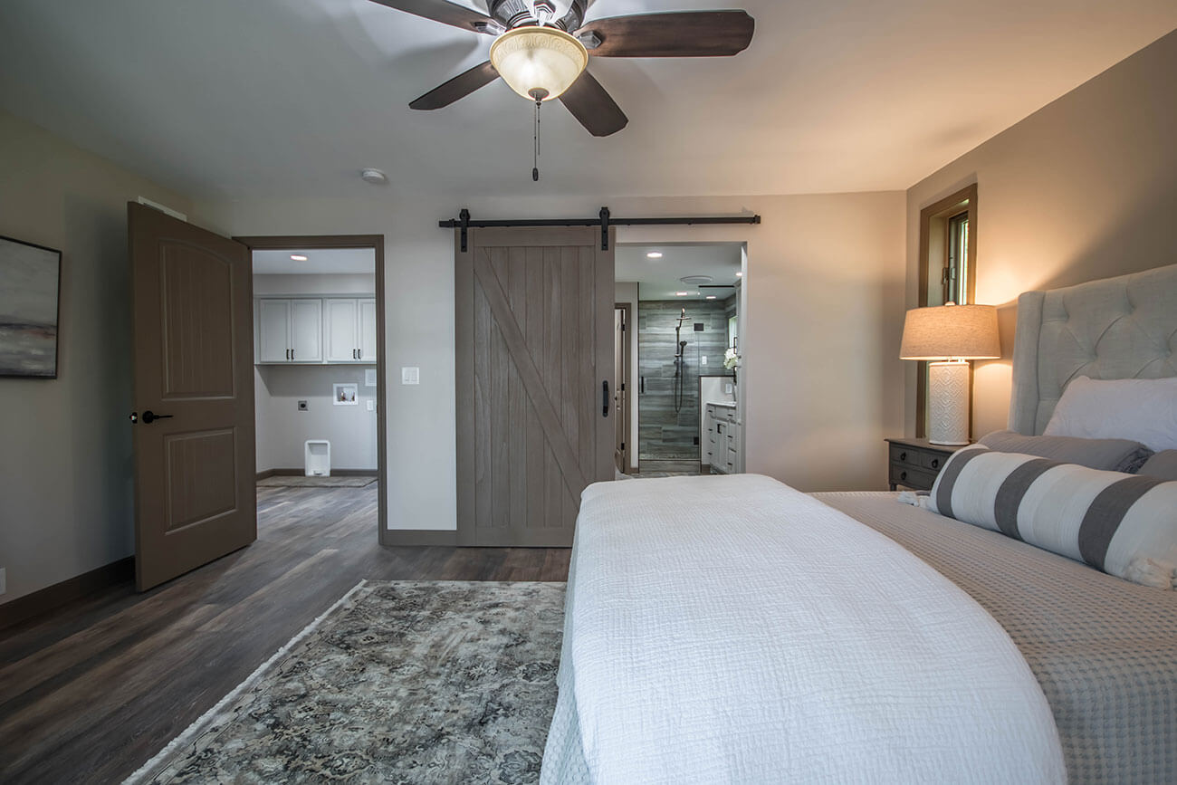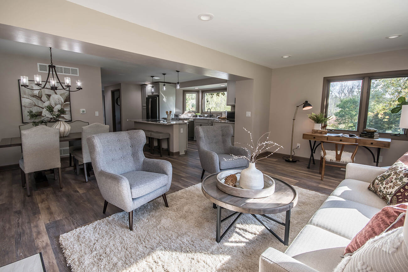 This farm house had been comprised of a series of add-ons upon add-ons, leaving it like a very narrow hallway in every room. We came in and gutted everything down to the studs, removed every interior wall and reinforced with 6 load bearing beams to create a much more open and usuable space. We replaced many windows, all the trim and doors, and added a little walk-in pantry.